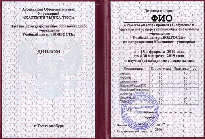 Оставьте заявку на нашем сайте и мы предоставим необходимый документ быстро и надежно. Стоимость диплома массажиста 6000 рублей.